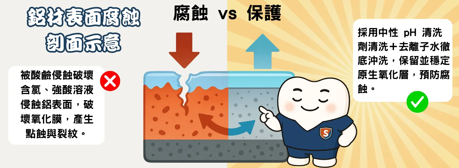 - 表面氧化層 (Al₂O₃) 若受機械刮傷或化學侵蝕,保護性能下降。