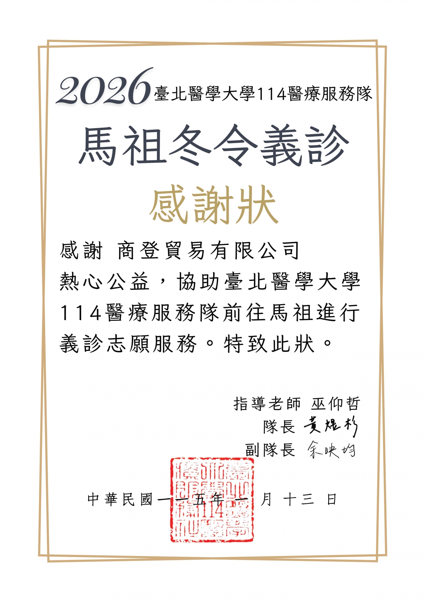2026 年寒冬,商登貿易有限公司很榮幸能支持「臺北醫學大學 114 醫療服務隊」前往馬祖進行冬令義診志願服務。