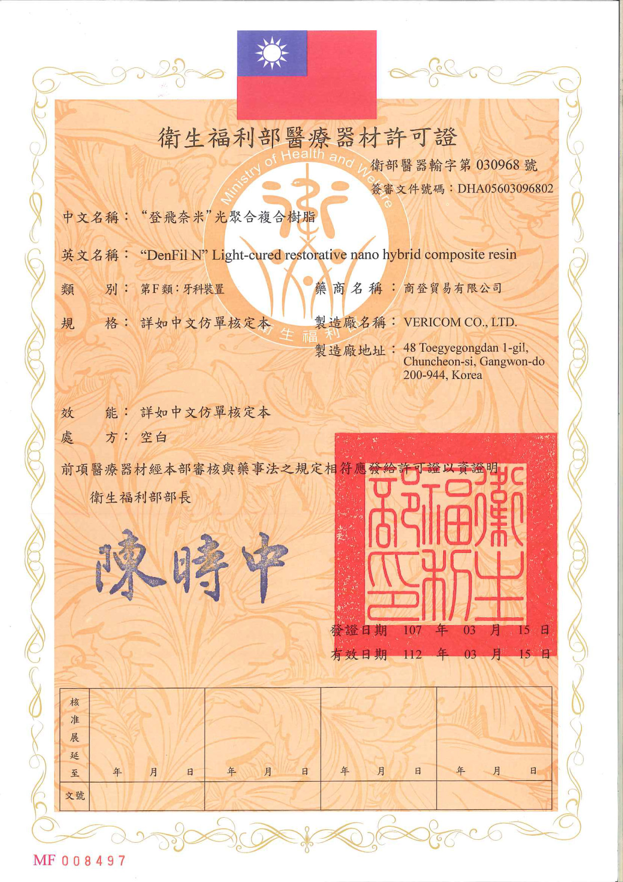 衛部醫器輸字第030968號