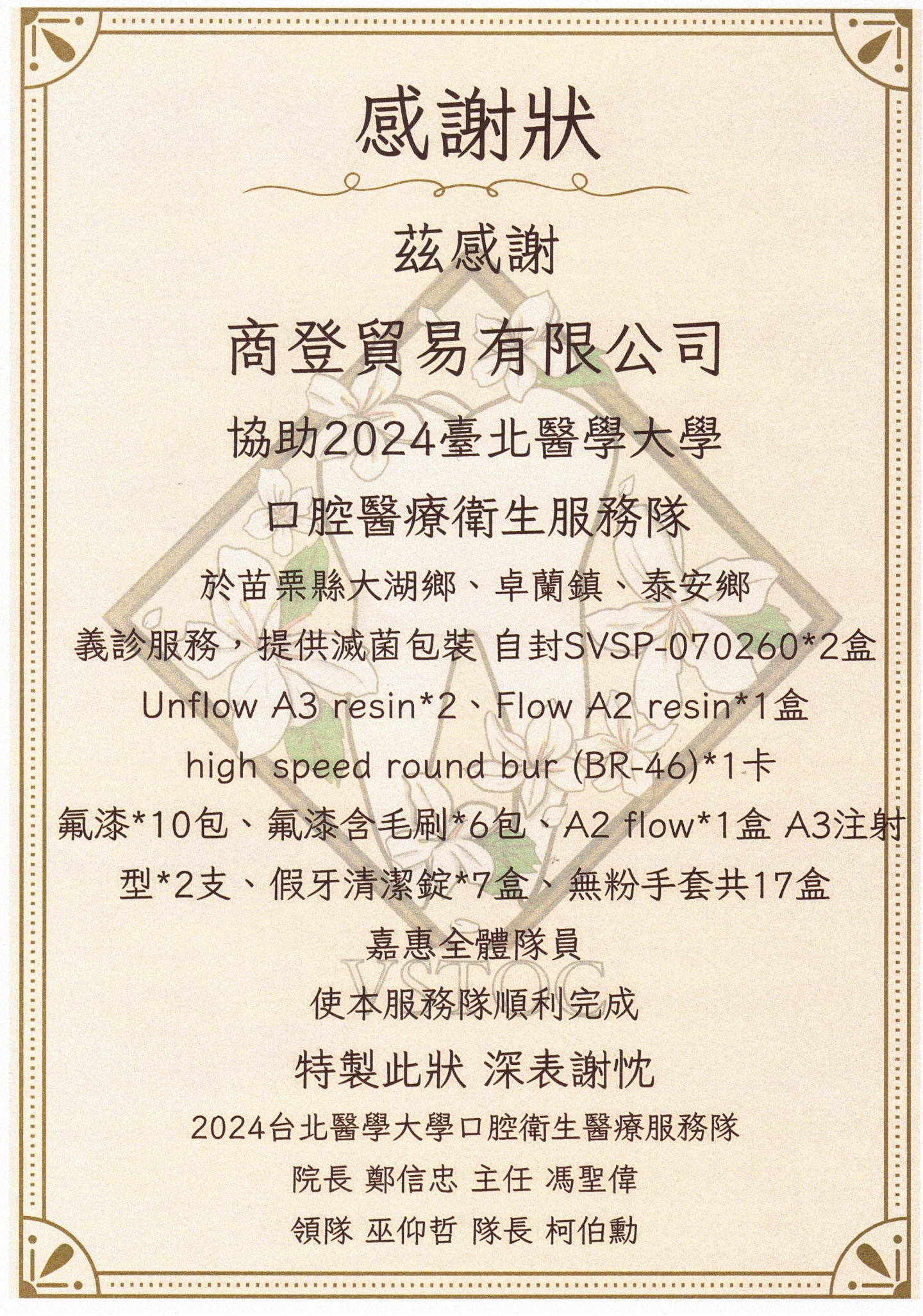 熱心公益-贊助2024台北醫學大學口腔醫療衛生服務隊於苗栗縣大湖鄉卓蘭鎮泰安鄉義診服務