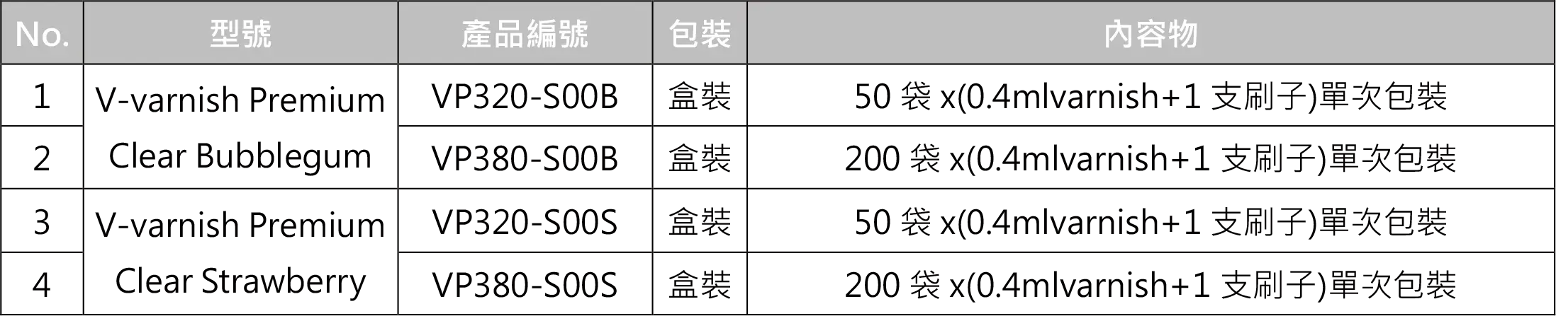 “微瓦”窩洞塗料 “V-Varnish Premium” Cavity Varnish 衛部醫器輸字第035293號 使用前請務必詳閱原廠之使用說明書並遵照指示使用 ■ 產品敘述 V-Varnish Premium 是含有5%氟化鈉(F離子:22,600ppm)的窩洞塗料。它被用於治療牙齒敏感。V-Varnish Premium由松香組成,它附著在牙齒表面,可以密封暴露在外的牙本質小管。 V-Varnish Premium 有2種味道,包含泡泡糖、草莓,以及一種顏色(透明) 。本產品採用單劑量包裝,並且易於混合和使用。 ■ 成分 - Rosin - Sodium Fluoride - Ethanol - Xylitol - TCP ■適應症(用途、效能) 用於治療繼發性暴露牙本質和牙根表面的牙齒敏感,透過由氟化納(Sodium Fluoride)和磷酸三氫三鈣磷(tricalcium phosphate)形成的沉澱物沉積在牙本質小管中並形成物理屏障。 ■ 禁忌症 1. 請勿用於潰瘍性牙齦炎或口腔炎患者。 2. 如果已知患者對包括氟化物,松香或類似材料在內的成分過敏,則不應使用V-Varnish Premium。 ■ 使用方法 1.徹底清潔牙齒,並用棉捲和空氣清除多餘的水分。 2.剝去箔紙紙,直到露出V-Varnish Premium。 3.用刷子徹底混合V-Varnish Premium。 4.用刷子塗上一層薄薄的V-Varnish Premium。 5.建議V-Varnish Premium停留在牙齒表面上至少維持4小時。 注意事項 1.本產品限牙醫師依說明書上的操作程序和注意事項操作使用。 2.應遠離非牙科使用者的範圍如兒童,老年人和其他人。 3.應避免接觸口腔軟組織、眼睛及皮膚,如不小心接觸到口腔軟組織,應立即使用軟毛刷移除。如不小心接觸到眼睛或皮膚,應立即使用自來水大量沖洗。 4.使用V-Varnish Premium後的4~6小時,患者應避免咀嚼硬食物、 喝含有酒精的飲料和刷牙。 5.避免吞食,在治療區域請使用剛好薄薄一層的量,如果患者不小心吞食,有可能會造成腸胃刺激請立即就醫。 6.請勿讓患者在同一天接受其它氟治療並在治療後的幾天停止使用含氟補充品或漱口水。 7.建議穿戴保護手套及護目鏡。 8.若發現包裝破損請勿使用。 9.本包裝限單次使用,未使用完之材料應拋棄。 10.過期請勿使用。(保存期限:2年) ■ 用量 V-Varnish Premium的使用人群是兒童(6個月至16歲)和成人。不必將包裝內提供的所有V-Varnish Premium使用完。需考慮到患者的體重和要治療的牙齒數量,僅使用足夠的V-Varnish Premium在所需的治療區域上形成薄膜。 (使用一次,最大容量為0.4毫升)通常每6個月重複使用V-Varnish Premium。但是,如果需要更多治療,則可以每3個月進行一次治療。治療後4小時內,患者不應刷牙或咀嚼食物。請諮詢您當地政府的建議,以獲取有關特定患者使用的氟化物含量的指導。 ■ 警告 僅在極少數情況下在某些氟化塗料產品會發生水腫或噁心的狀況,特別是在廣泛表面上使用後。呼吸困難,儘管極為罕見,但曾發生在哮喘患者中。如果需要,可以用刷子徹底的除去大量應用的塗料。 2.建議避免在孕婦和哺乳期使用。 ■ 保存 1.請問存放於升溫或強光處。 2.請存放於室溫陰涼處,並請勿放置於陽光下。 ■ 丟棄 請依照當地/國際規範丟棄產品。 ■ 型號及規格■ 符號