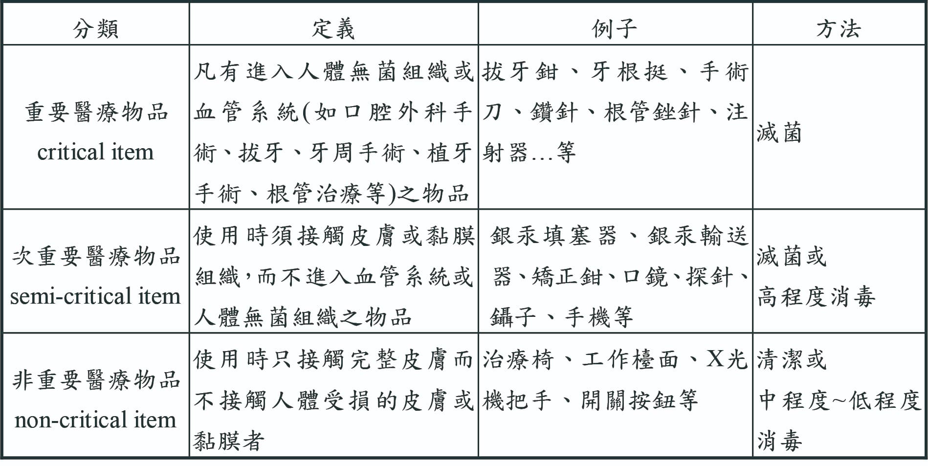 按照健康保險局公佈的牙科感染控制指南,醫療物品根據與人體組織接觸的感染風險分為三大類。